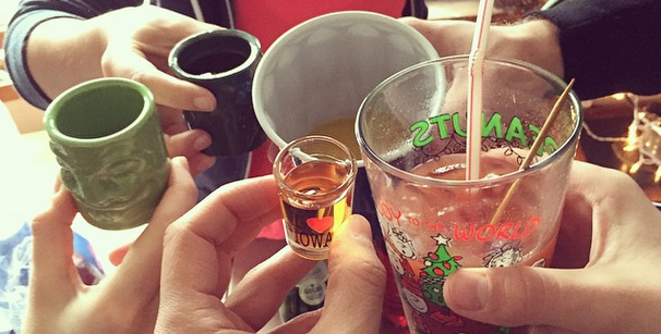 As for the vodka? Yeah, we dug it. Becky and I agreed that mixing a shot of UV Sriracha with some good ol’ supermarket-shelf Bloody mix yielded a pleasantly spicy drink that was at least as good as you’re apt to get at your local gastropub. We also took shots of UV’s Salty Caramel Apple vodka, which is intensely apple-y and paired well with Phillips peppermint schnapps and a seasonal candy-cane garnish.